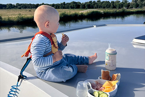 - dítě by mimo interiér lodě mělo mít vestu a ideálně popruh/vodítko pro bezpečný pohyb